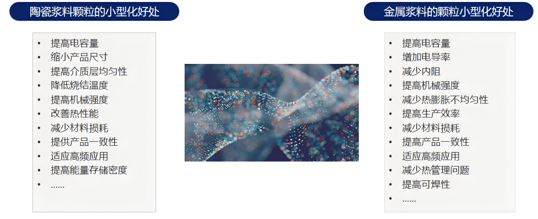 陶瓷漿料的顆粒小型化有提高電容量、降低燒結溫度、減少損耗等好處,而金屬漿料顆粒的小型化有增加電導率、減少內阻、適應高頻應用等好處。目前村田、太陽誘電等日系供應商普遍可以在1μm薄膜介質實現超過1000疊層,根據三星官網披露,其也可以實現600層工藝,而國內廠商做的最好的也只是幾百層,所以MLCC廠商都在朝著漿料顆粒的小型化、納米化方面來制備漿料,以降低介質厚度,增加層數。