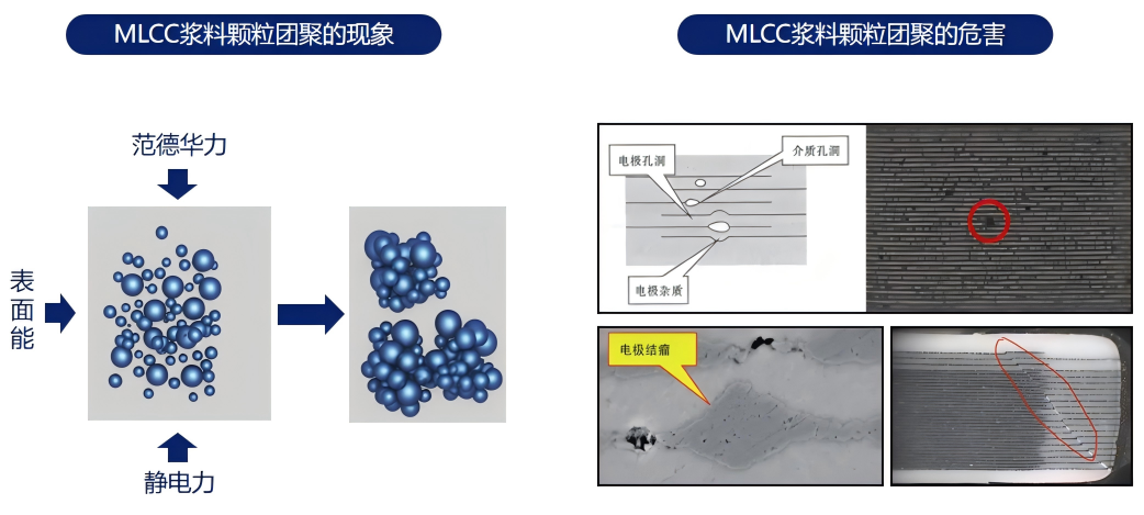 雖然小型化、納米化的漿料顆粒有諸多好處,但是大家也知道,隨著顆粒越小,顆粒會因為范德華力、表面能、靜電力等作用而團聚在一起。漿料顆粒團聚會造成陶瓷介質的空洞、電極雜質、器件開裂等等不良,這些不良現象也是限制MLCC良率提升和高端化的桎梏。