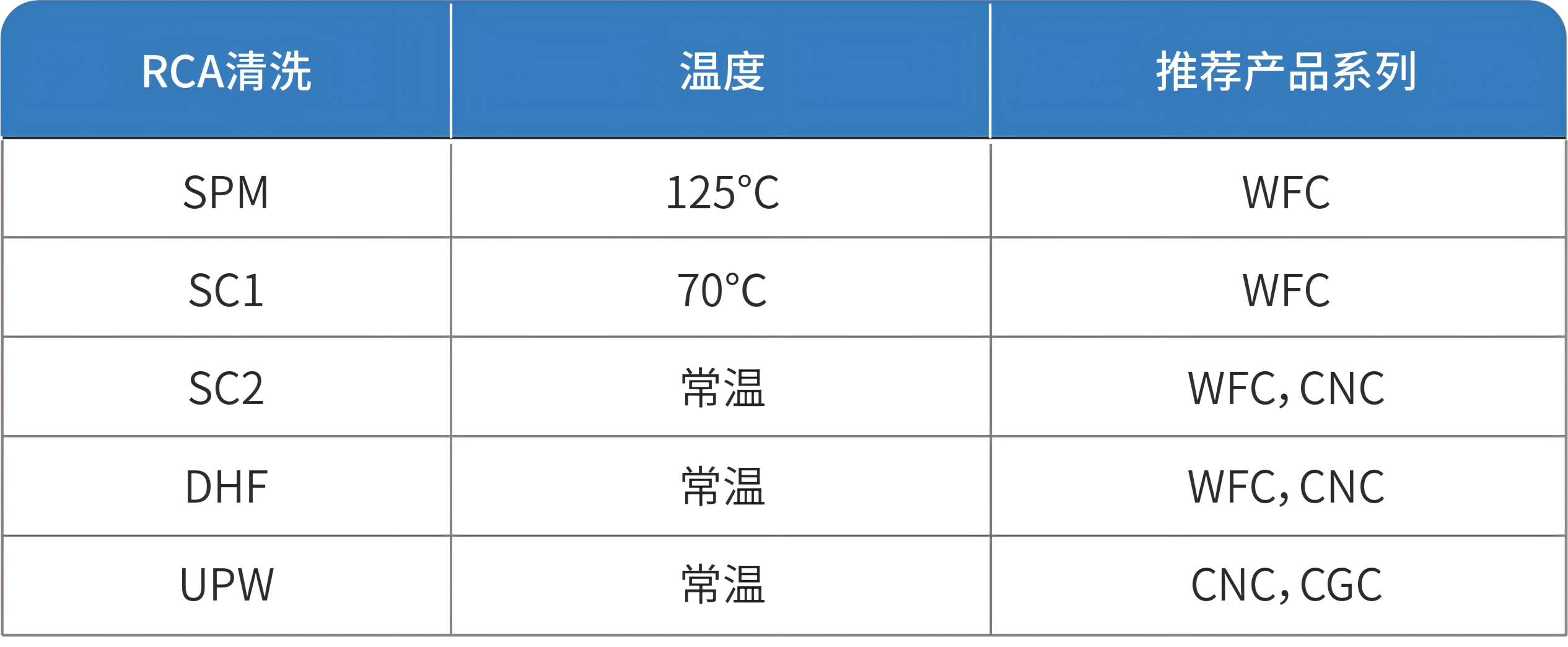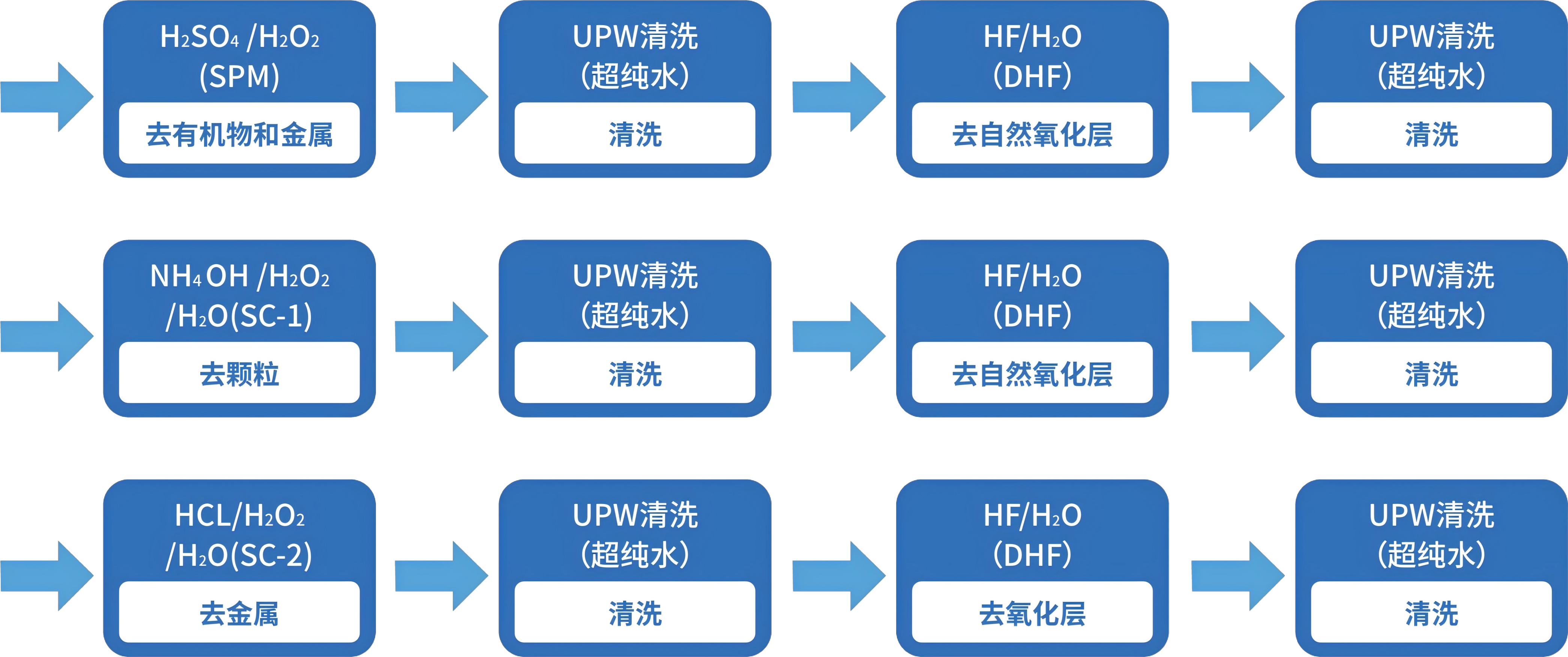 濕法清洗的清洗原理則是通過添加不同的化學試劑,與之對應的污染物進行反應,然后通過超純水沖洗連同試劑與污染物一并去除。截至目前濕法化學清洗技術仍是半導體IC工業中的主要清洗技術,其中最為經典的即是RCA清洗工藝。RCA清洗工藝是1965年由Kern和Puotinen等人在N.J.Princeton的RCA實驗室提出的,主要由過氧化氫和堿組成的1號標準清洗液(SC-1)以及由過氧化氫和酸組成的2號標準清洗液(SC-2)進行一系列有序的清洗。