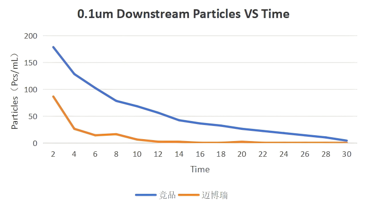 除此之外,高潔凈度濾芯的生產環節都有著嚴格的管控。第一,高潔凈度濾芯打折,焊接等生產工序在百級無塵車間,清洗工序在千級無塵車間中完成。第二,高潔凈度濾芯的原料進行檢測分級,并進行初步清洗。第三,定制化的濾芯清洗流程,每一只濾芯都經過多步驟的清洗。從下方圖表可知,通過多種有效的潔凈度管控,使得邁博瑞公司生產的濾芯金屬與顆粒脫落都達到一個較高潔凈度水平。
