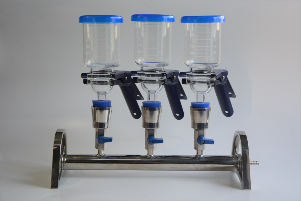 MS三聯(lián)過濾器由三個溶劑過濾器串聯(lián)而成、一次可同時過濾多個樣品。每個過濾孔均可獨立控制,可連接多種類型的漏斗,可蒸汽滅菌。標準多聯(lián)過濾器支架采用不銹鋼材質(zhì),換膜過濾器為特硬玻璃。三聯(lián)多聯(lián)過濾器使用時,只需一個真空泵,即可同時過濾多達多個樣品,過濾支架每個支座都備有獨立的控制閥門,具有安裝簡便、易消毒,提高平行實驗準確度,減少重復性過濾試驗次數(shù)等特點。
